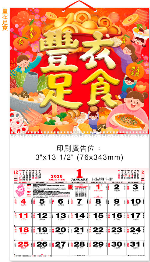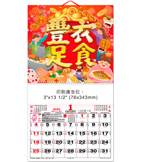 M26-04-BB 配印刷廣告,雙色月曆肉 (此款印刷肉沒有紅底咭) 印刷廣告為: 76 mm x 343 mm
